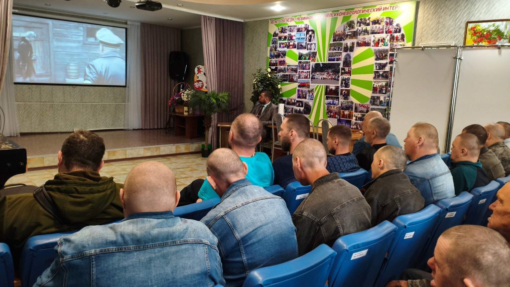 Библиотекарь Малеева Т.В. и проживающий Зеленский В.А. рассказали проживающим о невинных жертвах и преступлениях нацистов.
