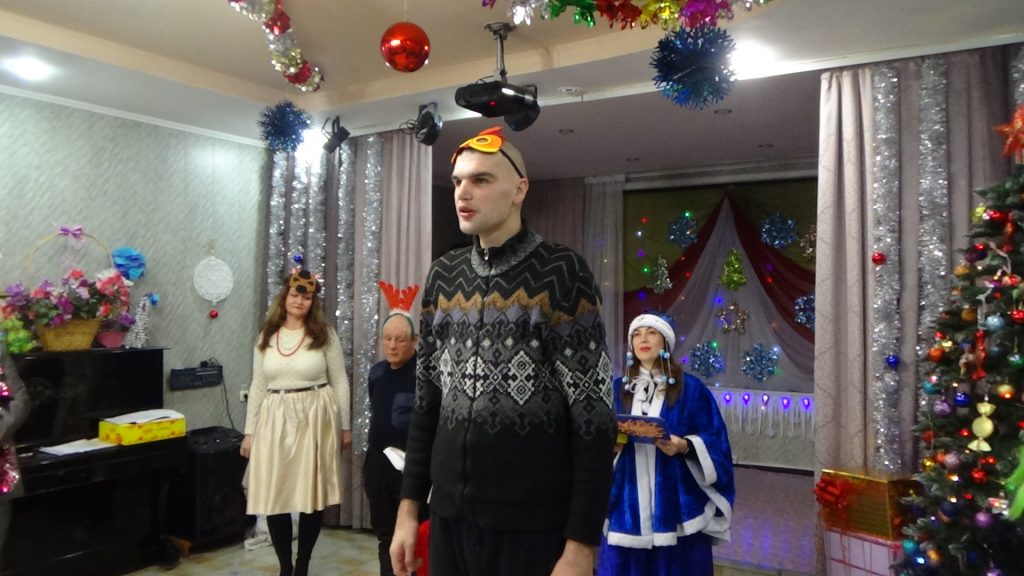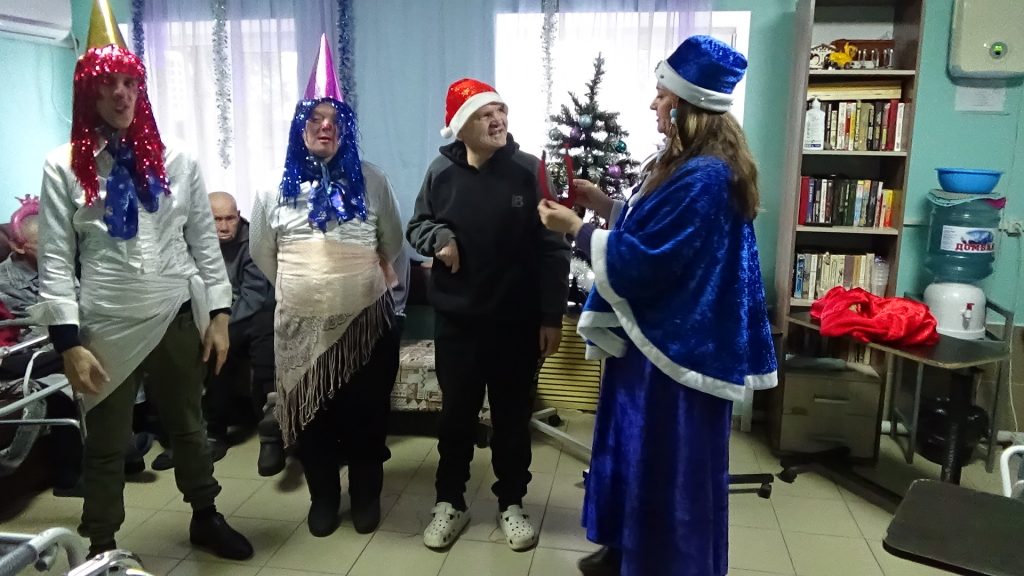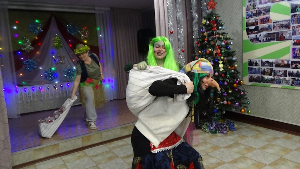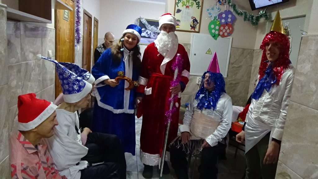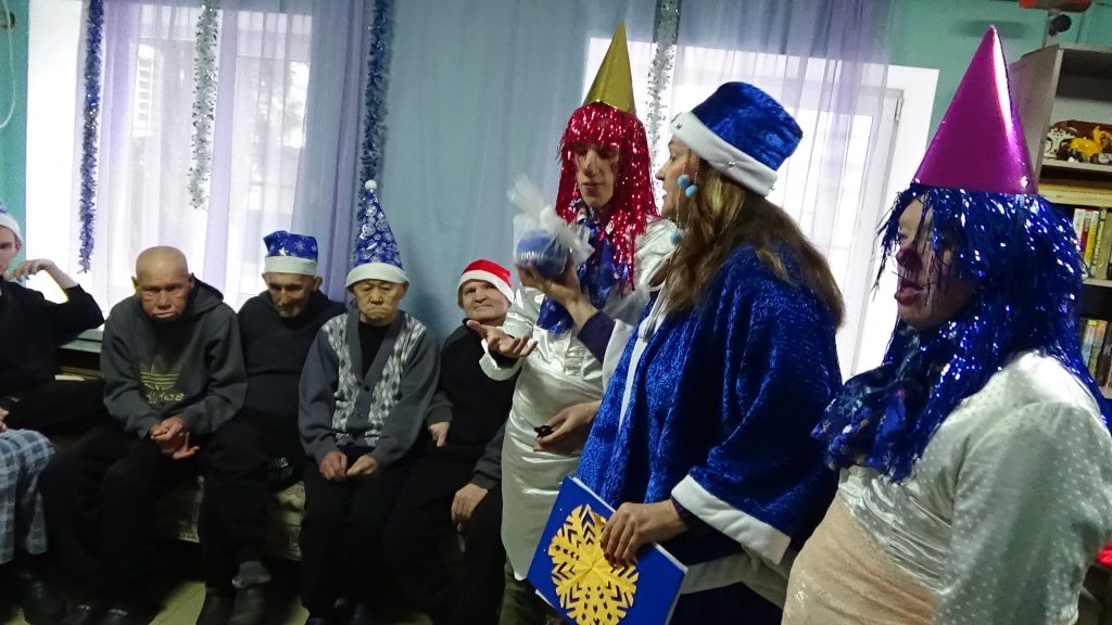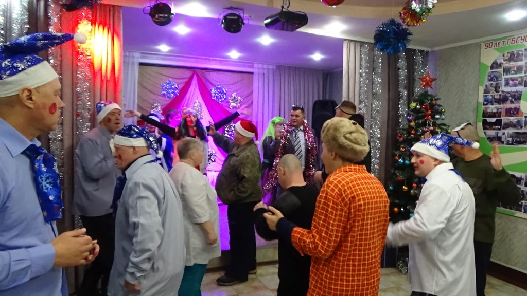 25декабря у нас в интернате состоялся праздничный вечер «Новогодний карнавал». С утра в отделениях милосердия добрые снеговички, Дед Мороз и Снегурочка поздравили получателей социальных услуг с наступающим Новым Годом и Рождеством! С большим удовольствием ребята играли в веселые игры, отгадывали загадки, пели песни и много шутили. Но, а вечером все дружно собрались на новогоднее представление, где «Кучка Злодеев» (Баба – Яга, Кикимора, и Леший), боролись с лошадкой Зорькой и ребятами за встречу Нового Года. Зло не хотело отступать и давать дорогу добру, нужно было много разгадывать загадок, участвовать в конкурсах, петь, танцевать и конечно веселиться! Молодцы ребята они так и сделали! Открыли новогодний бал, получили сладкие подарки от Деда Мороза и Снегурочки и дружно все вместе танцевали на новогодней дискотеке! С новым годом друзья! Счастья, здоровья и всего самого доброго!
