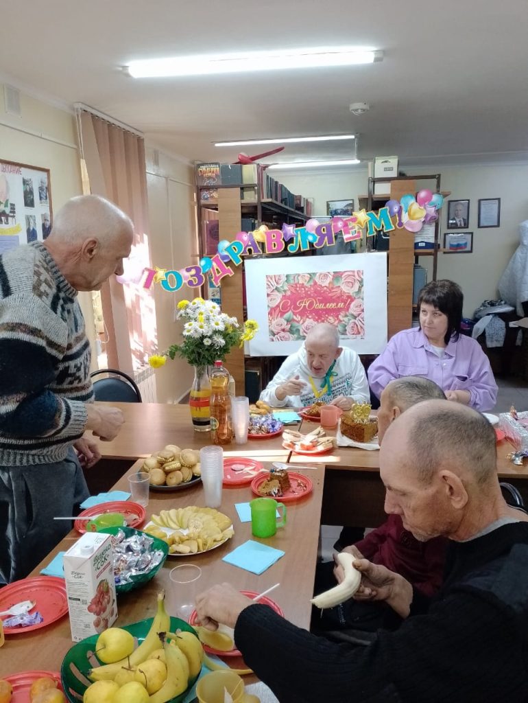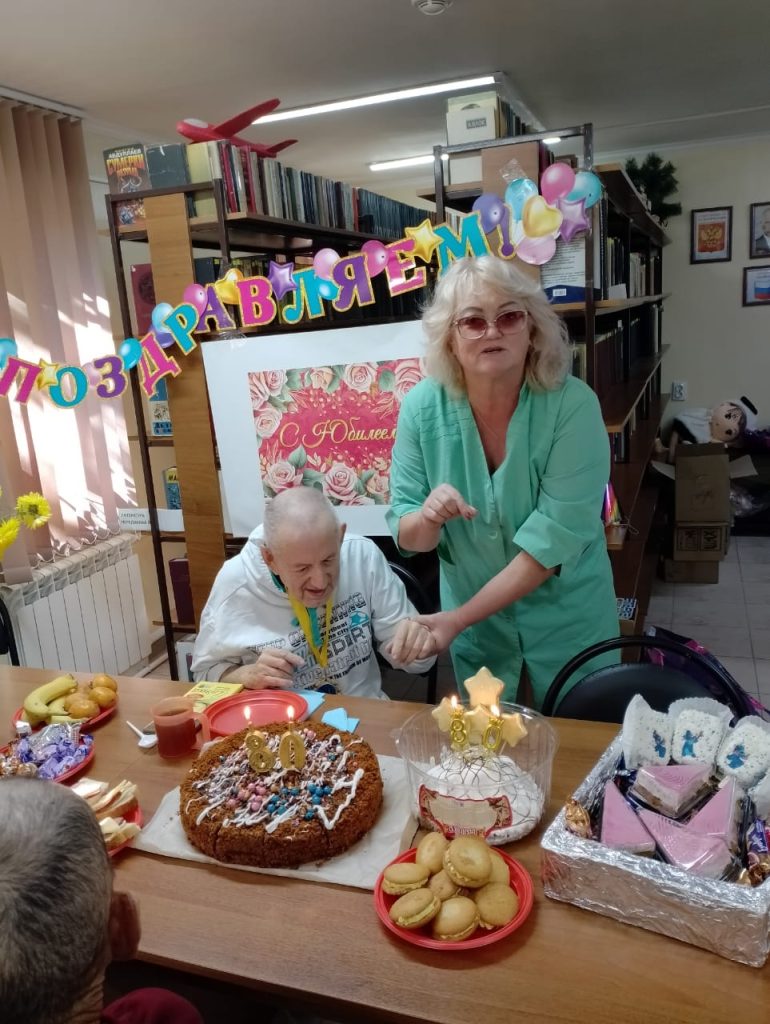 Сегодня в библиотеке для Леонида Ивановича и его гостей был накрыт праздничный стол. В этот день его поздравляли и дарили подарки сотрудники, ребята, волонтёры и, конечно же, родственники. Хоть он и не слышал всех слов, но прикосновения, светлые лица друзей и родных для него стали самым большим подарком в этот день.